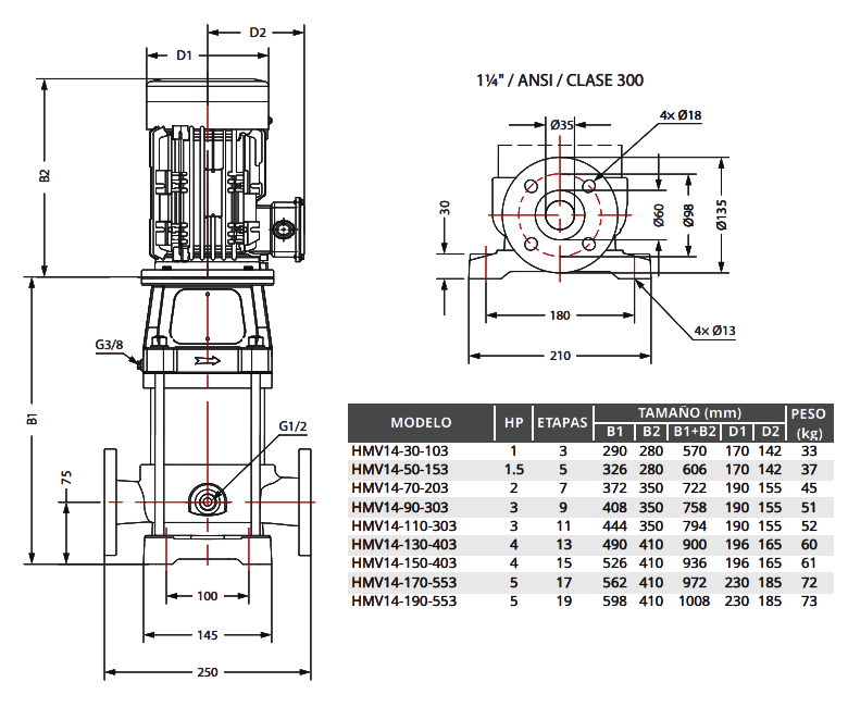 Las bombas de la serie HMV están diseñadas para garantizar que puedan instalarse directamente en el sistema de tuberías con los mismos diámetros y que la salida y la entrada estén al mismo nivel.