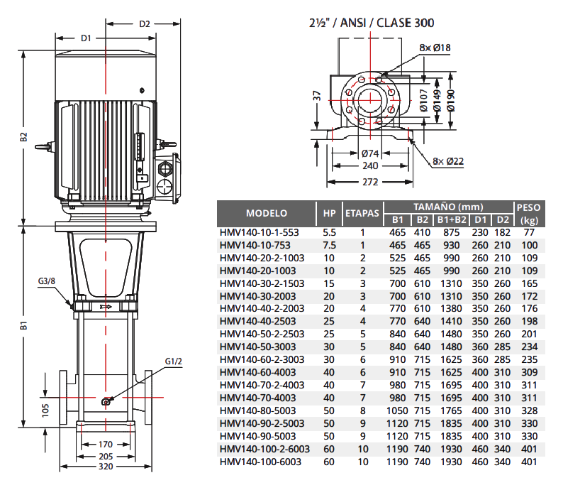 Las bombas de la serie HMV están diseñadas para garantizar que puedan instalarse directamente en el sistema de tuberías con los mismos diámetros y que la salida y la entrada estén al mismo nivel.