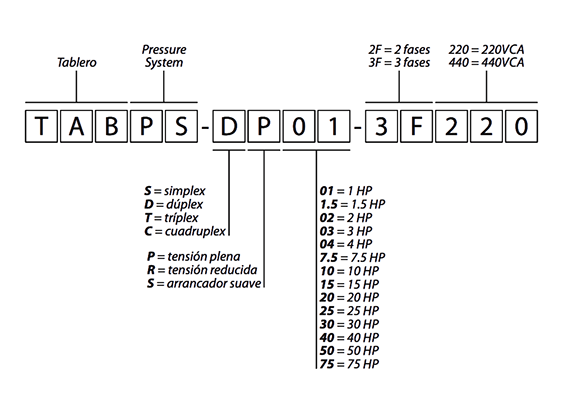 S = 1 / D = 2 / T = 3 / C = 4 | Por ejemplo, para el caso de un tablero TAB PS- N P01-3F220 de 3 bombas sería TAB PS- T P01-3F220.